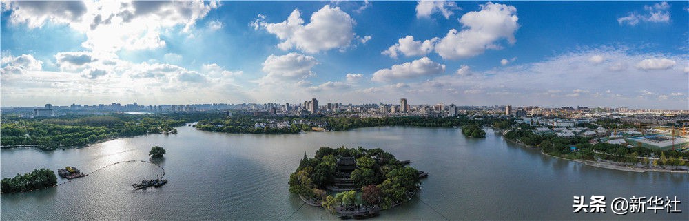 空中俯瞰嘉兴南湖及嘉兴城区(无人机照片,2020年10月27日摄)。新华社记者 徐昱 摄