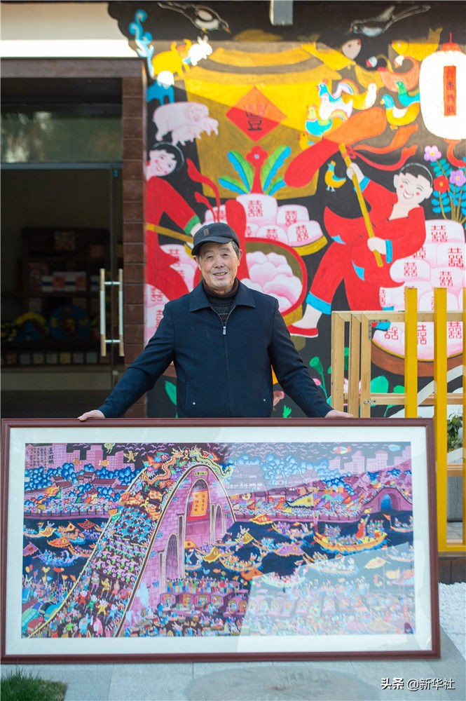 嘉兴市秀洲区油车港镇胜丰村村民张金泉与自己的画作《国泰民安》合影(2020年12月15日摄)。新华社发(江汉 摄)