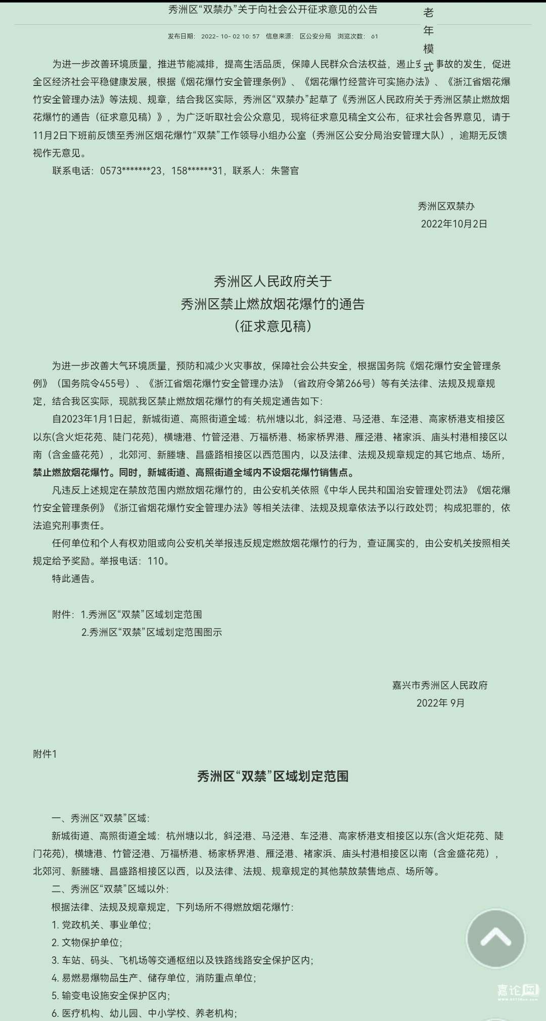 进一步改善环境质量,推进节能减排,提高生活品质,保障人民群众合法权益,遏止安全事故的发生,促进全区经济社会平稳健康发展,根据《烟花爆竹安全管理条例》、《烟花爆竹经营许可实施办法》、《浙江省烟花爆竹安全管理办法》等法规、规章,结合我区实际,秀洲区“双禁办”起草了《秀洲区人民政府关于秀洲区禁止燃放烟花爆竹的通告(征求意见稿)》,为广泛听取社会公众意见,现将征求意见稿全文公布,征求社会各界意见,请于11月2日下班前反馈至秀洲区烟花爆竹“双禁”工作领导小组办公室(秀洲区公安分局治安管理大队),逾期无反馈视作无意见。