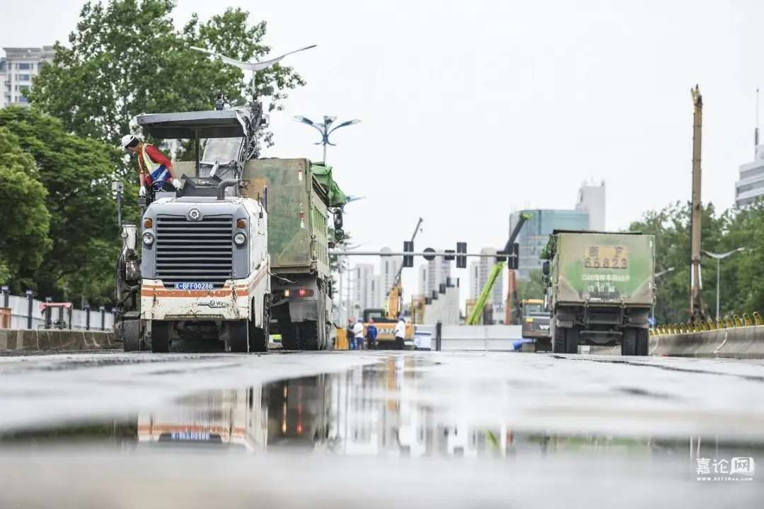 今天(5月23日)上午,在嘉兴市区快速路环线工程三期一阶段施工2标现场,铣刨机在穆湖桥上缓缓移动,密布锥齿的铣削转子高速运转,正一层一层地磨去老桥上的沥青层……