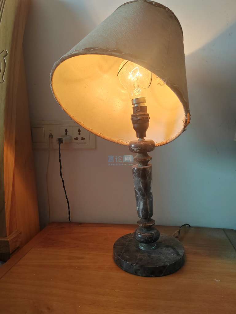 家里仍然在用的这只台灯是一九七几年的产物,应该超过50年的历史啦。台灯的底座是一块圆形花纹大理石做成的,台灯的主杆(把手)也是大理石和金属圆柱体(圈)做成的,台灯的灯罩是后来更新的。整只台灯的主体做工得体并精巧。