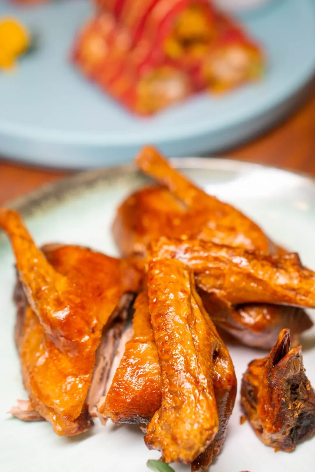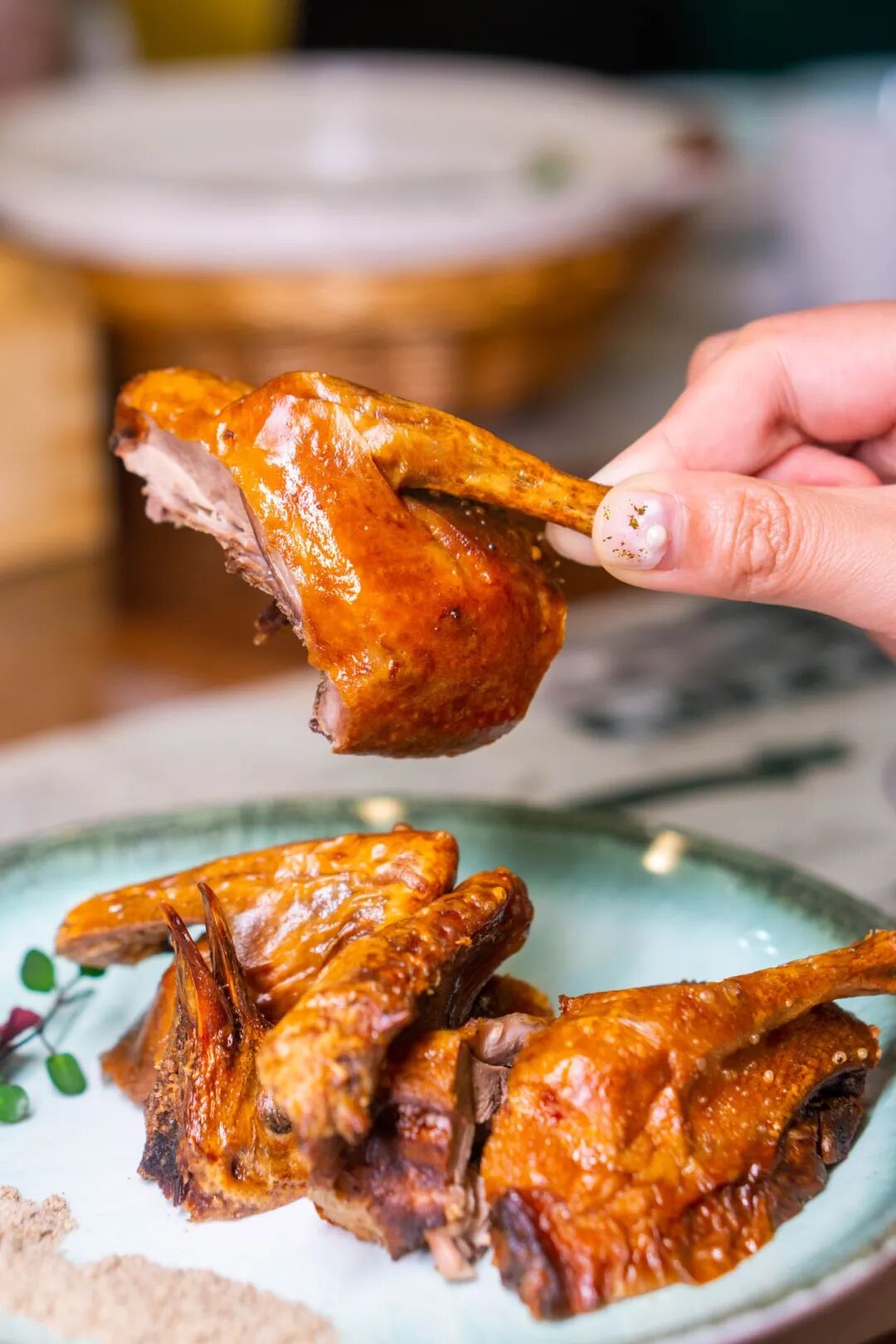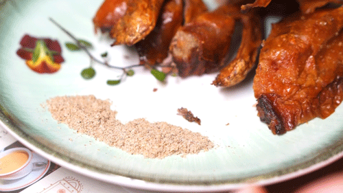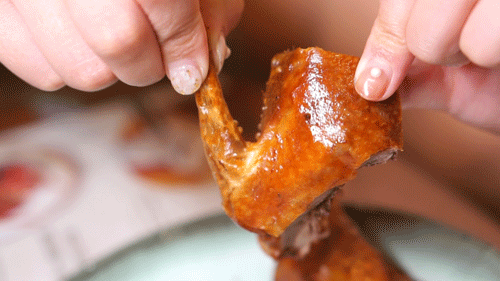 这么可爱的乳鸽当然要立马上手啦 轻轻一撕就能感受到它有多酥脆 而上面的 酥皮 则可以算是招牌乳鸽的精华