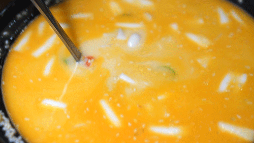 现场用炒制好的香米倒入金黄色的汤内 不一会就会膨胀变成正常的粥饭