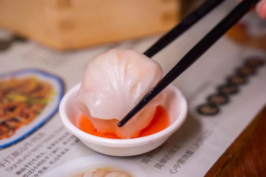 蘸点秘制醋大口咬下 韧性十足的虾饺皮很有嚼劲 内里的虾肉则是 鲜香弹牙,汁水丰富 鲜美又爽滑的口感让人根本停不下来