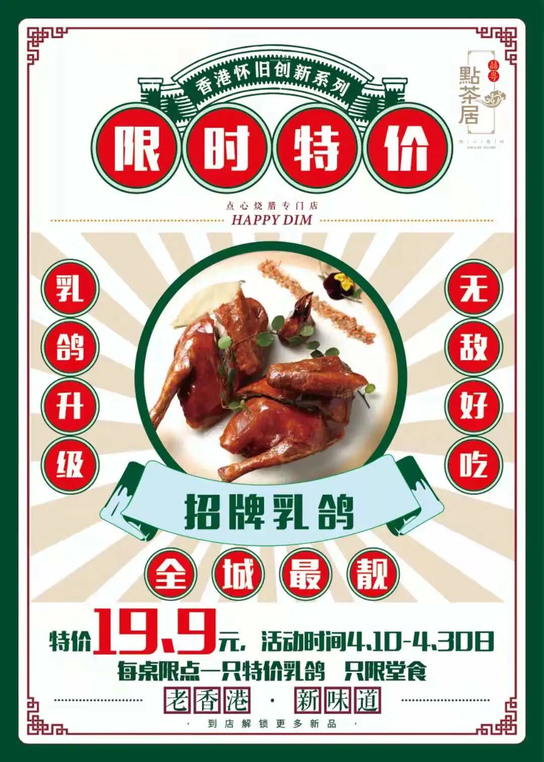 福利一: 4月 10 日 - 4 月 30日 招牌乳鸽福利价 仅需 19.9元 / 只