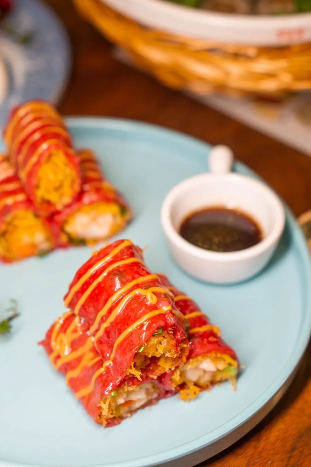 每一块都色泽饱满,金黄流油,看着就馋! 寡吃肉太单调,配上老板亲调的酸梅酱和 姜蓉汁既解腻又丰富了口感~